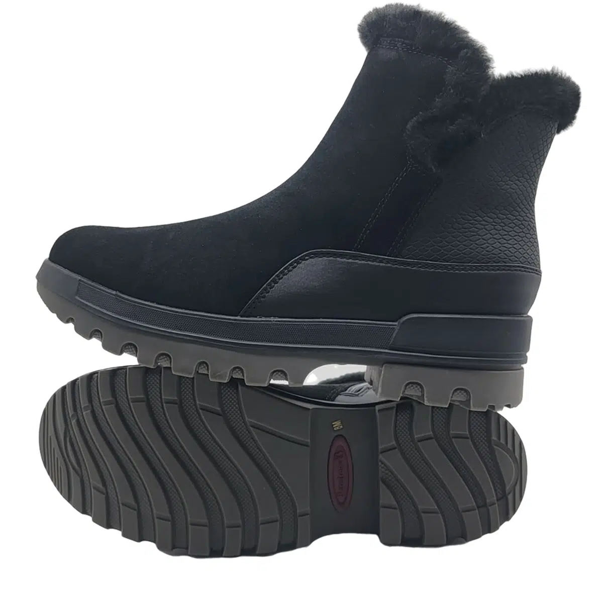 These Black winter boots look fantastic paired with skinny jeans or leggings tucked in, or with trousers that break just above the ankle. The fur trim and suede finish add a cozy, rustic touch perfect for a casual winter look.