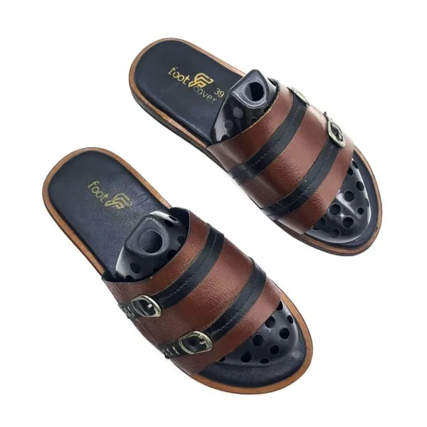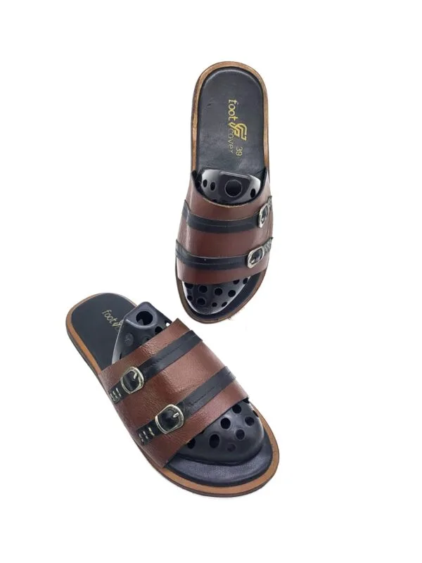 Discover the perfect blend of casual comfort and innovative design with the footCover Men’s Two-Tone Buckle Slide Sandals. Designed for the modern man, these slides feature a broad strap crafted from smooth, two-tone faux leather in brown and black, accented with two sleek metallic buckles for a touch of subtle sophistication. The open-toe, slip-on design ensures ultimate convenience, making them ideal for quick wear around the house or for relaxed outdoor gatherings. The standout feature is the unique footbed, which includes circular perforations for enhanced breathability and a contoured surface for superior comfort and grip. With a durable, flexible sole, these footCover slides provide excellent support and cushioning throughout your day. Their versatile design makes them an essential addition to your relaxed footwear collection.