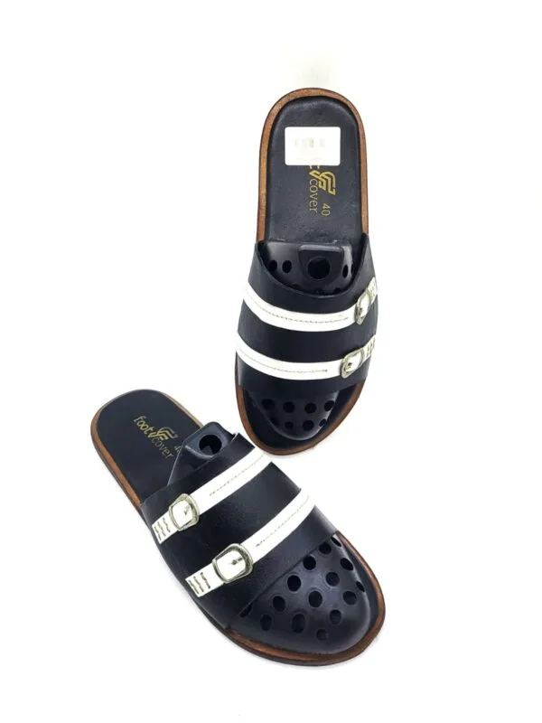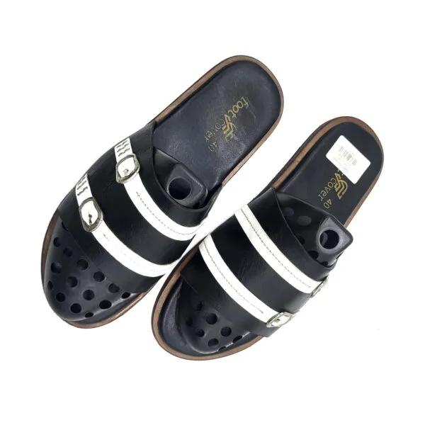 Discover the perfect blend of casual comfort and innovative design with the footCover Men’s Two-Tone Multi-Strap Slide Sandals. Designed for the modern man, these slides feature a broad strap crafted from smooth, two-tone faux leather in black and white, accented with three sleek metallic buckles for a touch of subtle sophistication. The open-toe, slip-on design ensures ultimate convenience, making them ideal for quick wear around the house or for relaxed outdoor gatherings. The standout feature is the unique footbed, which includes circular perforations for enhanced breathability and a contoured surface for superior comfort and grip. With a durable, flexible sole, these footCover slides provide excellent support and cushioning throughout your day. Their bold, contrasting design makes them an essential addition to your relaxed footwear collection.