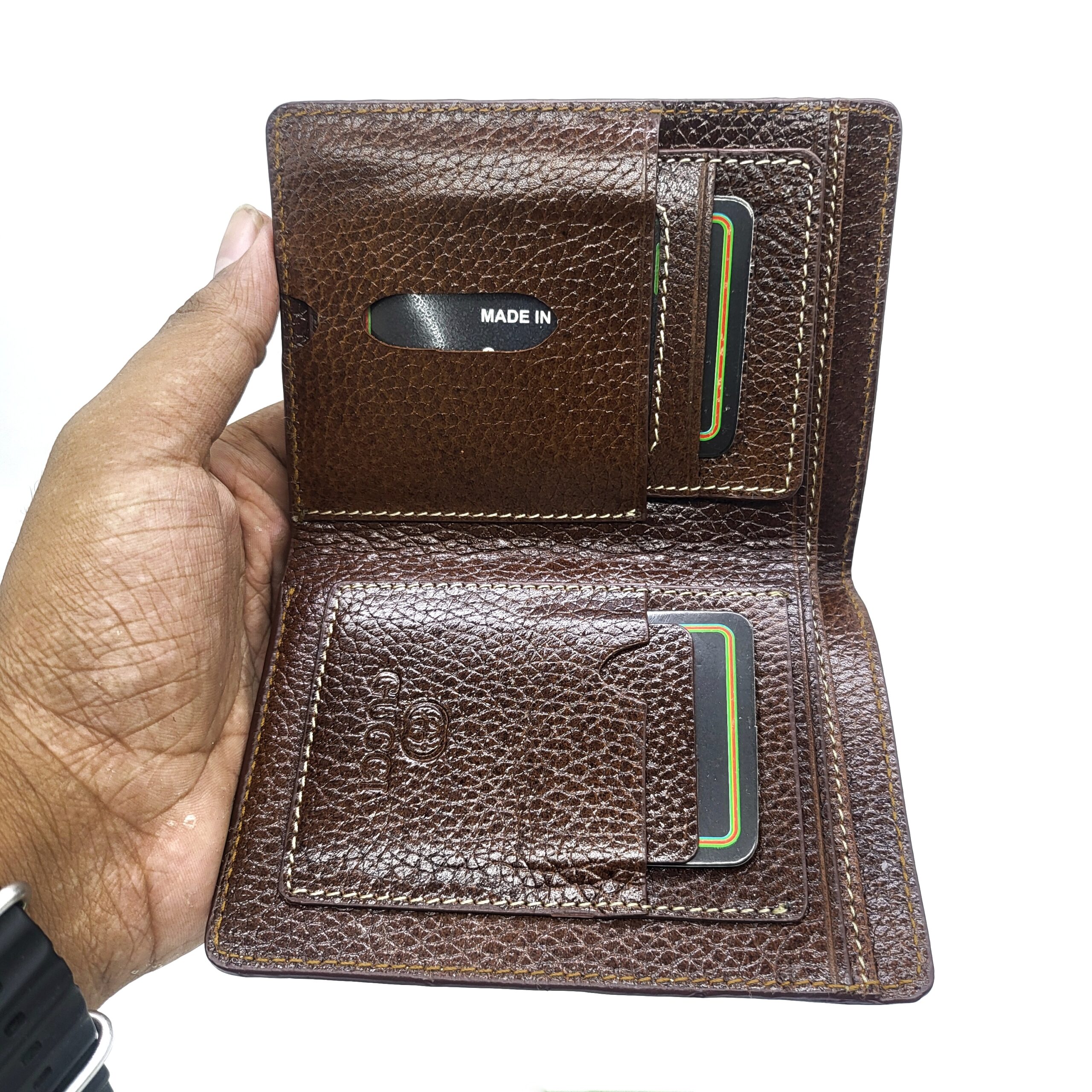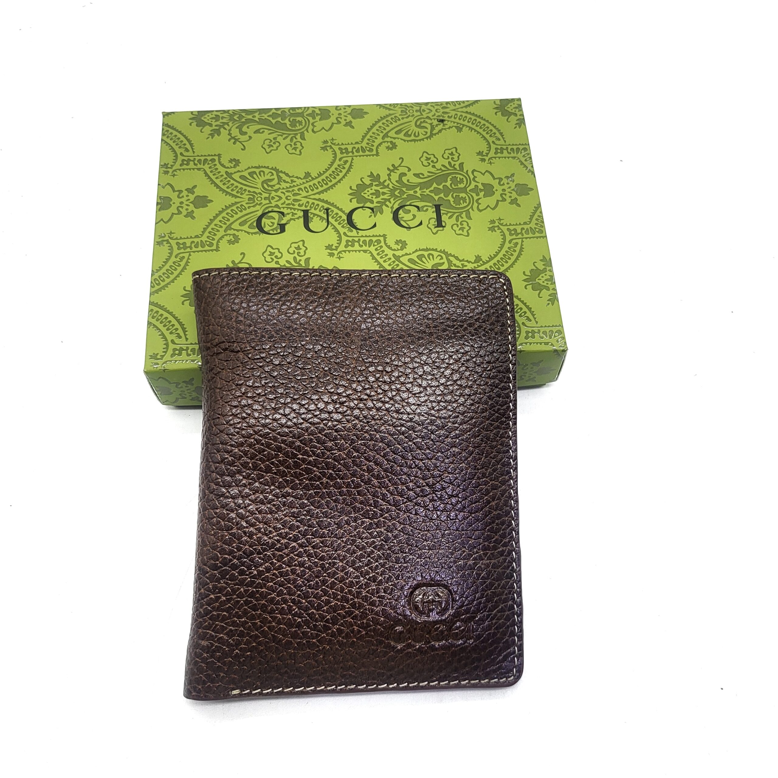 Gucci men’s premium brown leather short wallet with a classic bifold design & white stitching. Perfect for daily essentials.