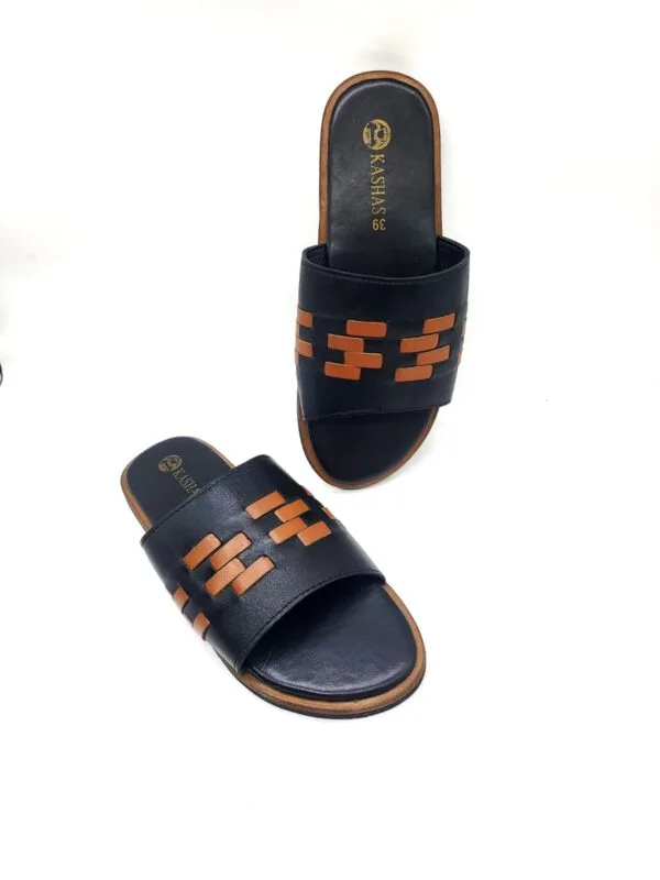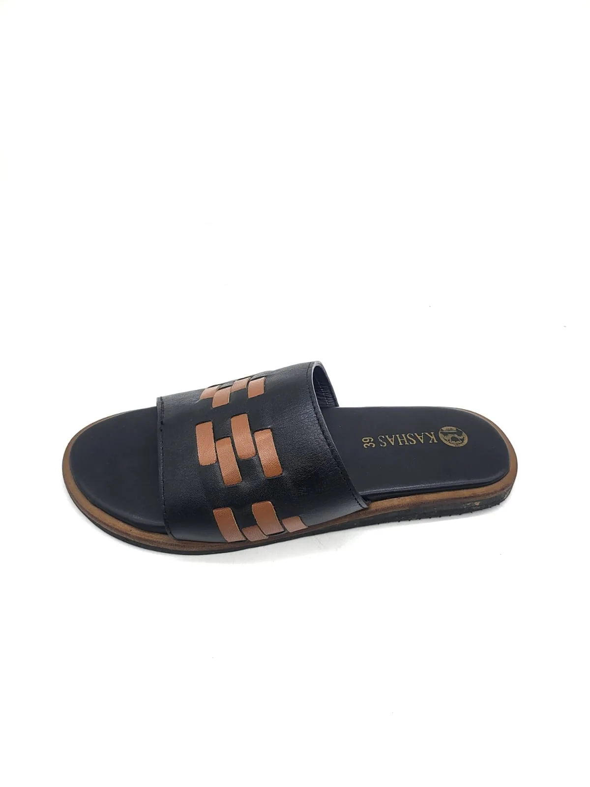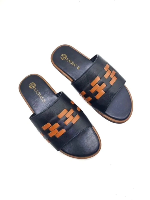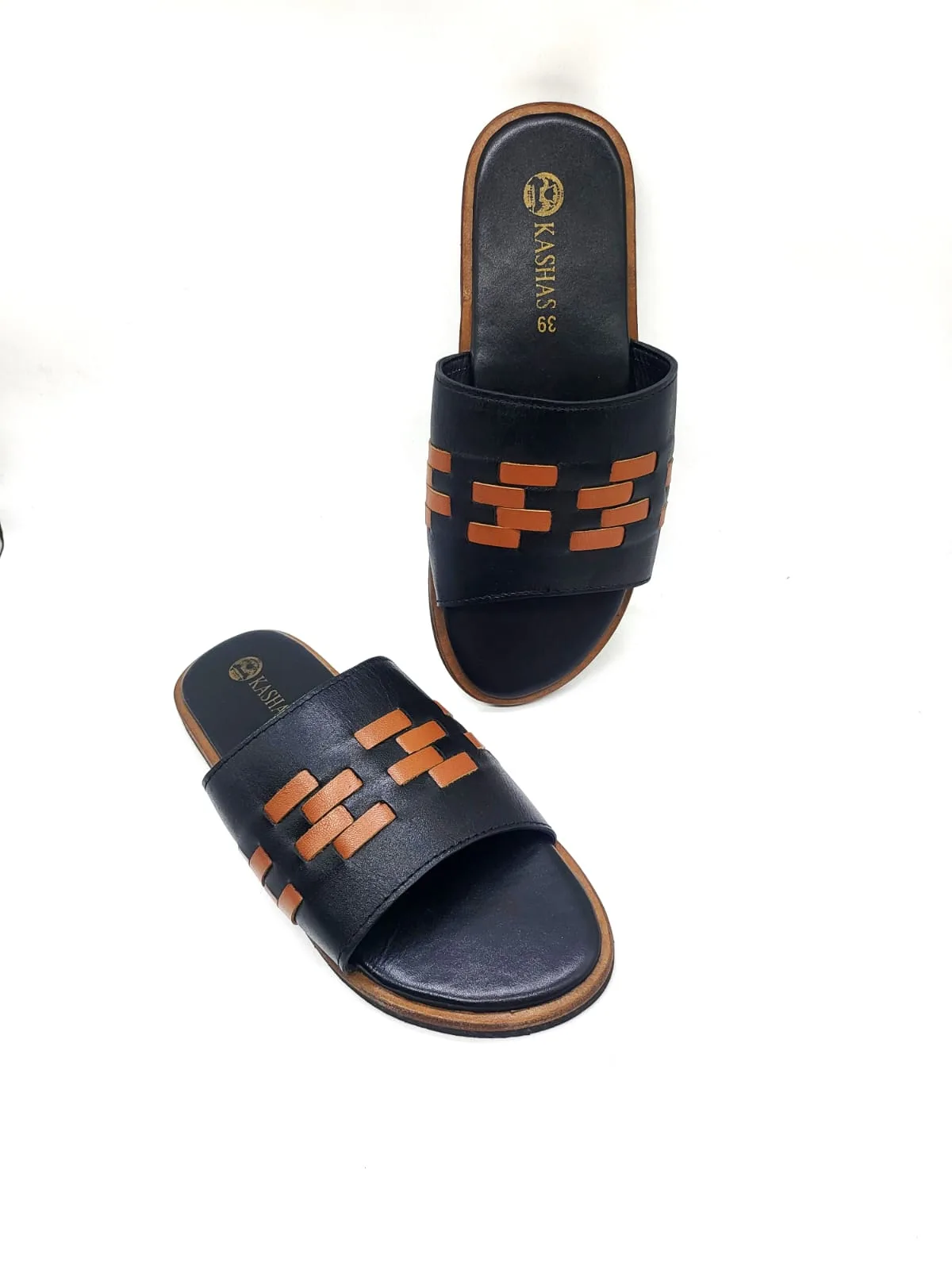 Discover the perfect blend of casual comfort and distinctive style with the Kashas Men’s Black & Brown Woven-Strap Slide Sandals. Designed for the modern man who values both aesthetics and ease, these sandals are a versatile addition to your everyday wardrobe. They feature a striking two-tone design with a black leather-like strap and a unique woven or lattice-style pattern in a rich brown/tan. This intricate detailing adds a touch of craftsmanship and a modern visual appeal. The open-toe, slip-on style ensures effortless wear, making them ideal for quick errands or relaxed gatherings. With a comfortable, contoured footbed and a durable sole, these Kashas sandals provide excellent support and a laid-back, stylish look for all-day wear.