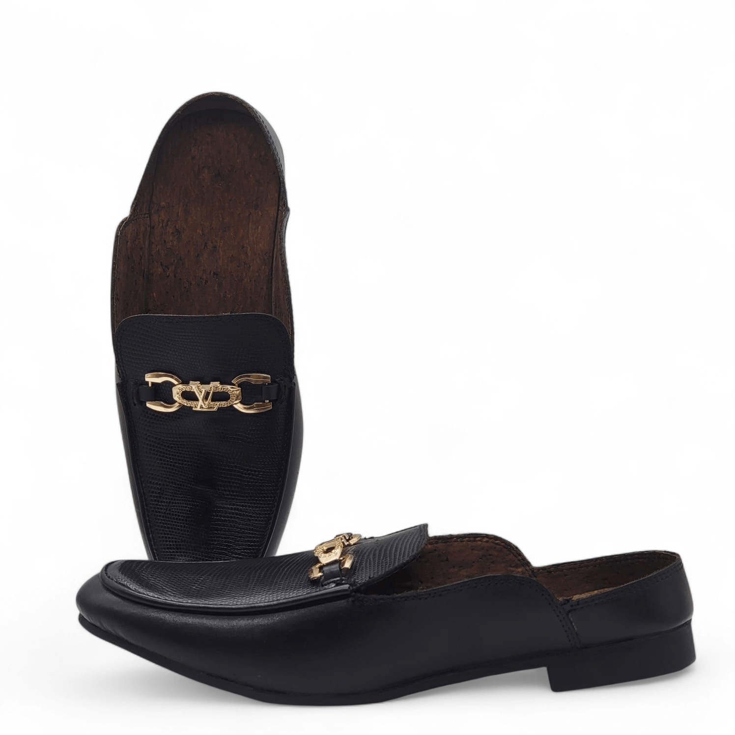 Elegant Design:Â These slip-on loafers feature a timeless silhouette, accented with a striking gold-tone chain across the vamp for a touch of luxury.