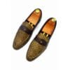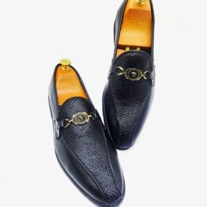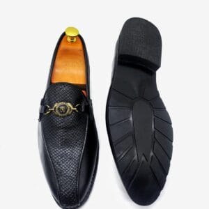 Command attention with the Versace Men’s Luxury Black Snakeskin-Effect Medusa Bit Loafers, a true embodiment of high-fashion and distinctive elegance. These extraordinary slip-on loafers feature a striking all-black design, where a sleek, smooth finish on the toe and heel elegantly transitions into a bold, textured snakeskin-effect vamp. This sophisticated combination reflects Versace’s renowned audacious aesthetic. Adorning the vamp is a prominent gold-tone metallic bit, featuring the iconic Medusa head emblem at its center, adding a touch of unparalleled luxury and signature style. Designed for both stunning visual impact and supreme comfort, these loafers boast a plush inner lining and a durable, yet flexible sole, ensuring a refined and confident stride for any occasion. Perfect for making a grand entrance at formal events, business gatherings, or elevating your sophisticated casual attire, these Versace loafers are an indispensable statement piece for the gentleman who truly appreciates opulence and unmatched style.