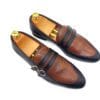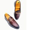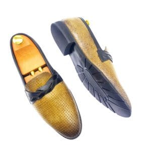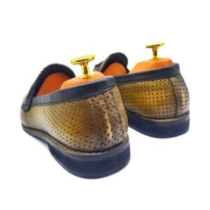 Command attention with the Versace Men’s Luxury Two-Tone Snakeskin-Effect Loafers, a masterpiece of design crafted for the modern connoisseur of fine footwear. These exquisite loafers feature a striking contrast with their sleek black base and a vibrant reddish-brown/orange vamp showcasing an authentic snakeskin-effect texture, reflecting Versace’s bold and luxurious aesthetic. A distinguished dark brown strap gracefully spans the vamp, adding a touch of classic elegance to the modern design. Designed for both visual impact and supreme comfort, these slip-on loafers boast a luxurious inner lining and a sturdy yet comfortable sole, ensuring a refined experience with every step. Perfect for adding a touch of high-fashion luxury to your business attire, formal events, or making a grand impression at sophisticated casual gatherings, these Versace loafers embody prestige and unmatched style.